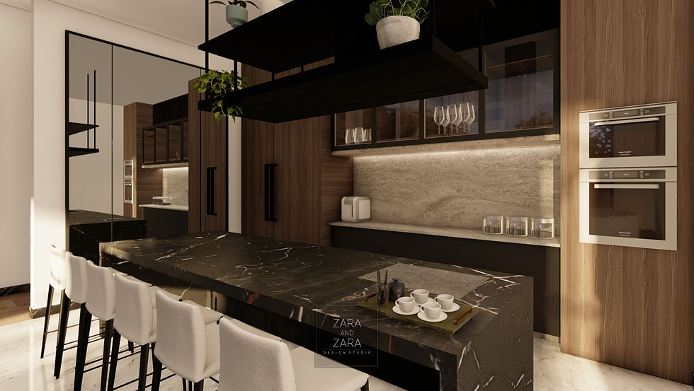 The Fatani residence is a composition of intricate wall paneling, rich, luxurious flooring, and modern, recessed ceilings. While the material palette errs on the cooler side, a homely touch of warm textures and mediums strikes an ideal balance. Each space of this home is inviting for the audience that it hosts, whether it is the welcoming aura of the foyer or the cozy lofts of the bedrooms.